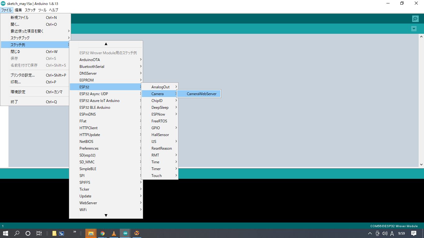 ソフトは [ファイル] - [スケッチ例] - [ESP32] - [Camera] - [Camera Web Server] で選択したスケッチ例をベースにします。