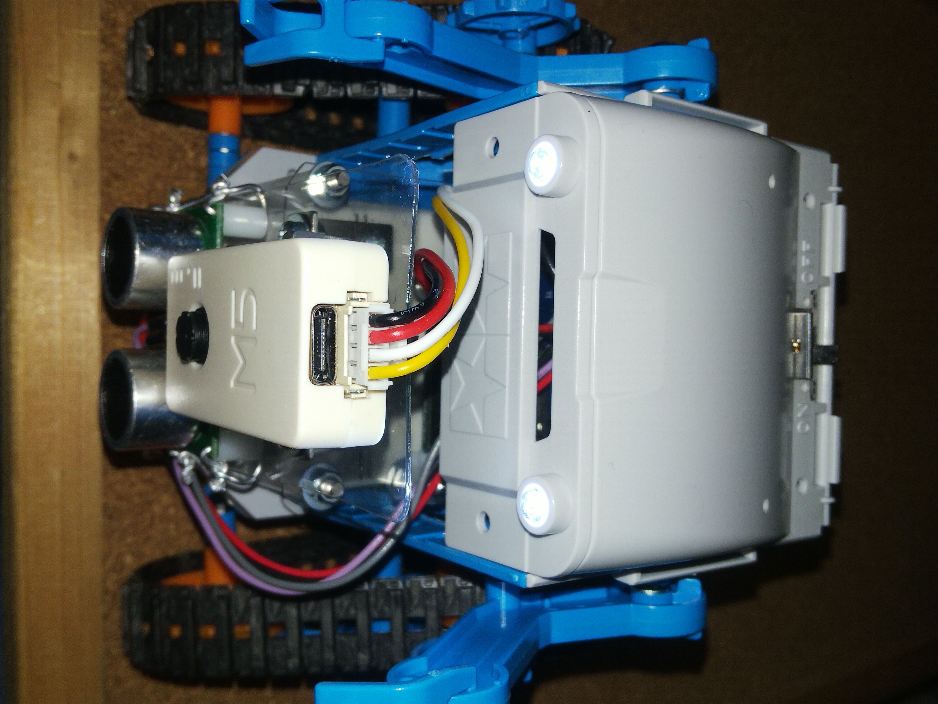それに、WiFiで映像を送れる Webカメラを構成できる"M5カメラ" を取り付け、遠隔制御ロボットのシステムを実現しました。