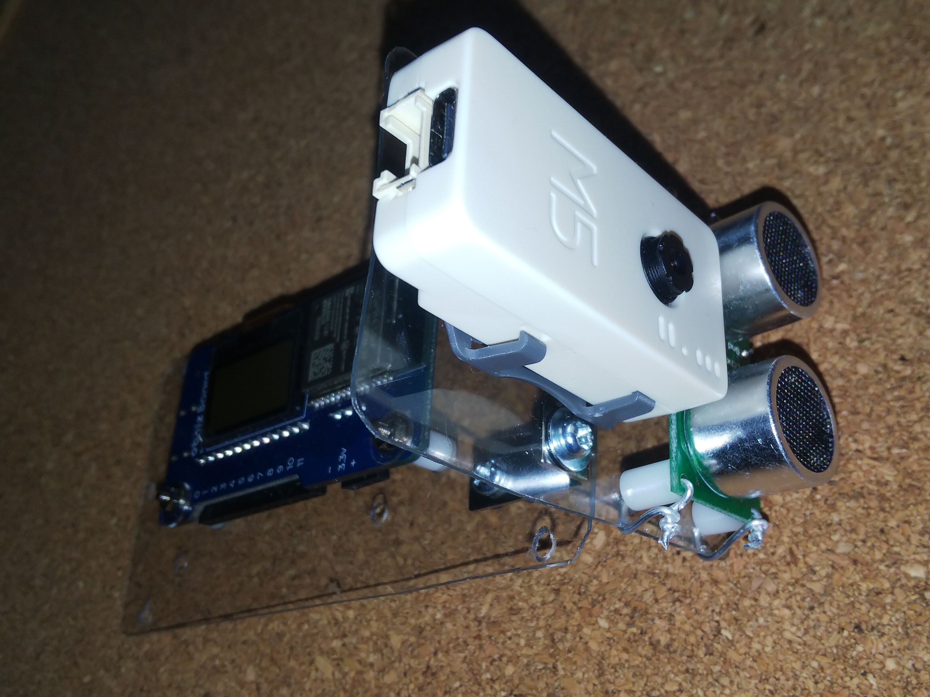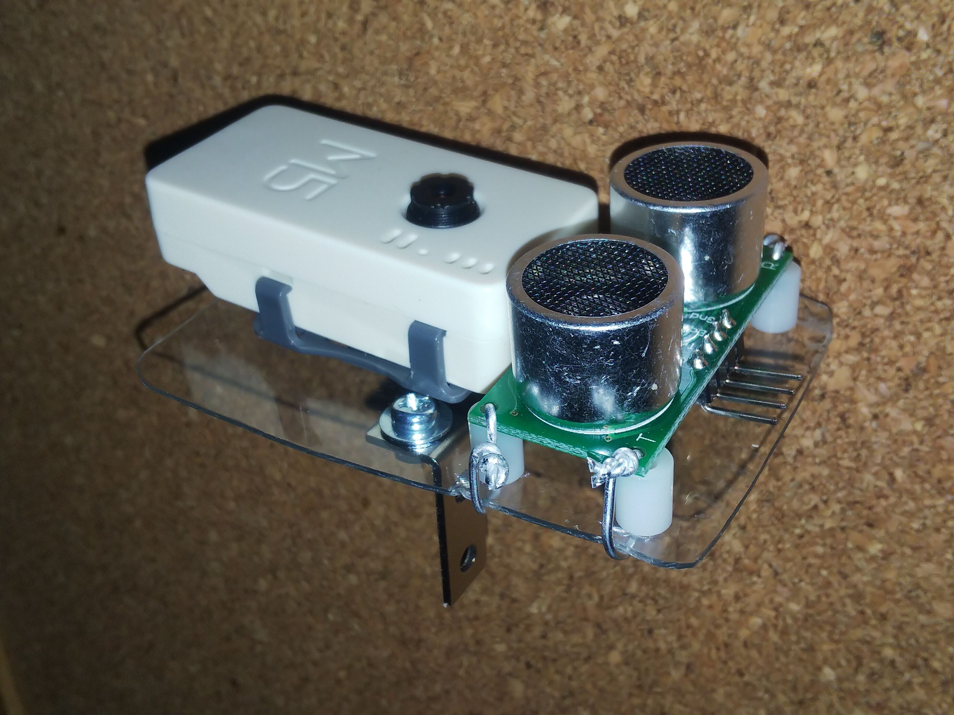 次にM5 カメラと距離センサを取り付けます。距離センサーは 1mm の穴が開いていますが 1mm のビスやスペーサーは手に入らなかったので、0.7mm のアルミ針金とスペーサーで固定しました。(力業!?)