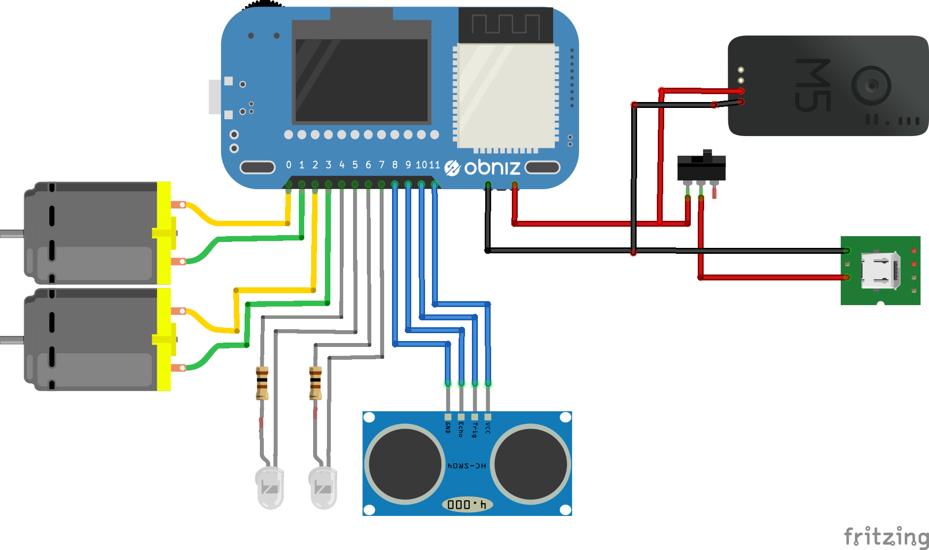obniz はカムロボに取り付けられた、モーター、LED、距離センサー等を制御します。