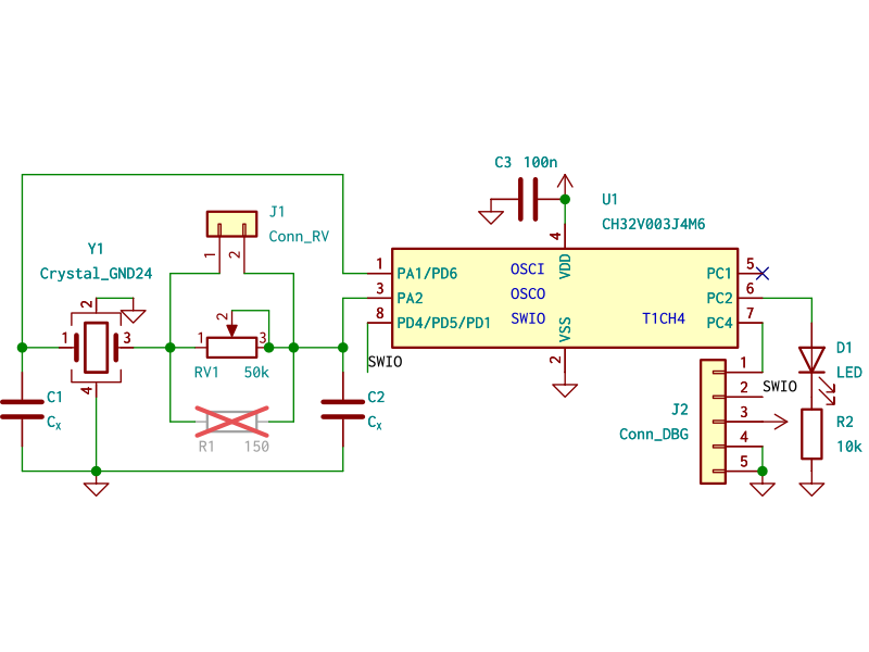 マイコン内蔵 RC 発振器の周波数は不安定だということが分かったので、CH32V003 の動作クロックを安定なものとするため、水晶振動子を使おうと思いました。発振回路は設計が雑だとうまく発振しないことがあると聞くので、色々と情報を調べて設計しているところです。