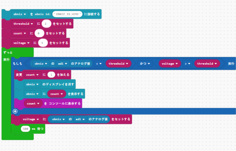 この間の電圧を500msごとに測定し,閾値を下回ったタイミングでカウントを追加します.
