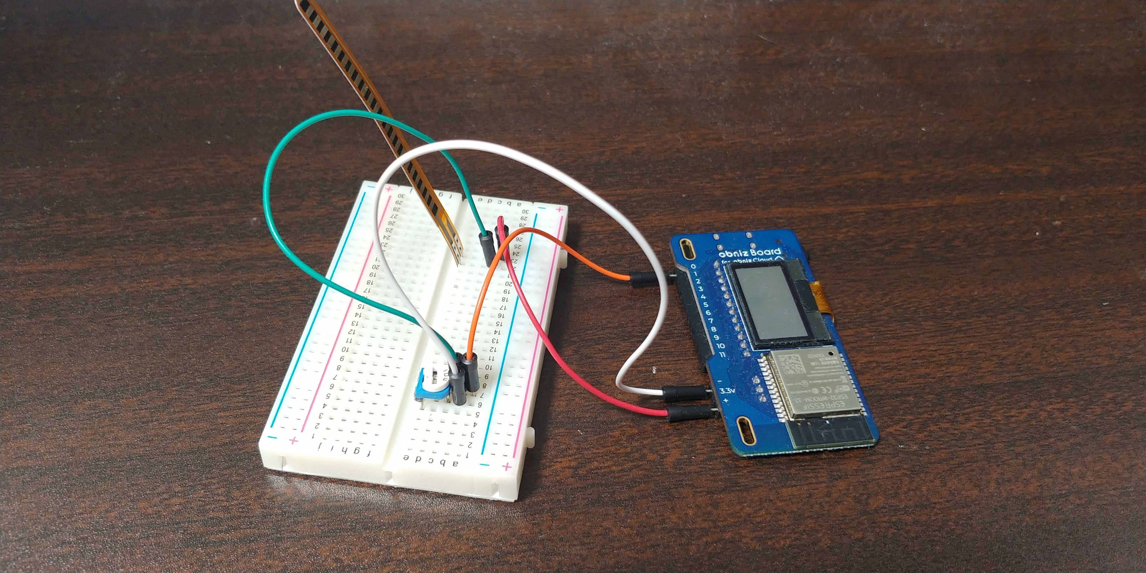 曲げセンサーと半固定抵抗を直列で繋ぎobnizの5Vを分圧することで,間の電圧が変化します.