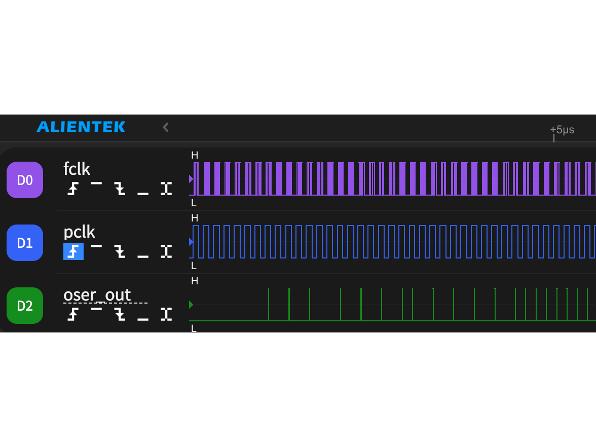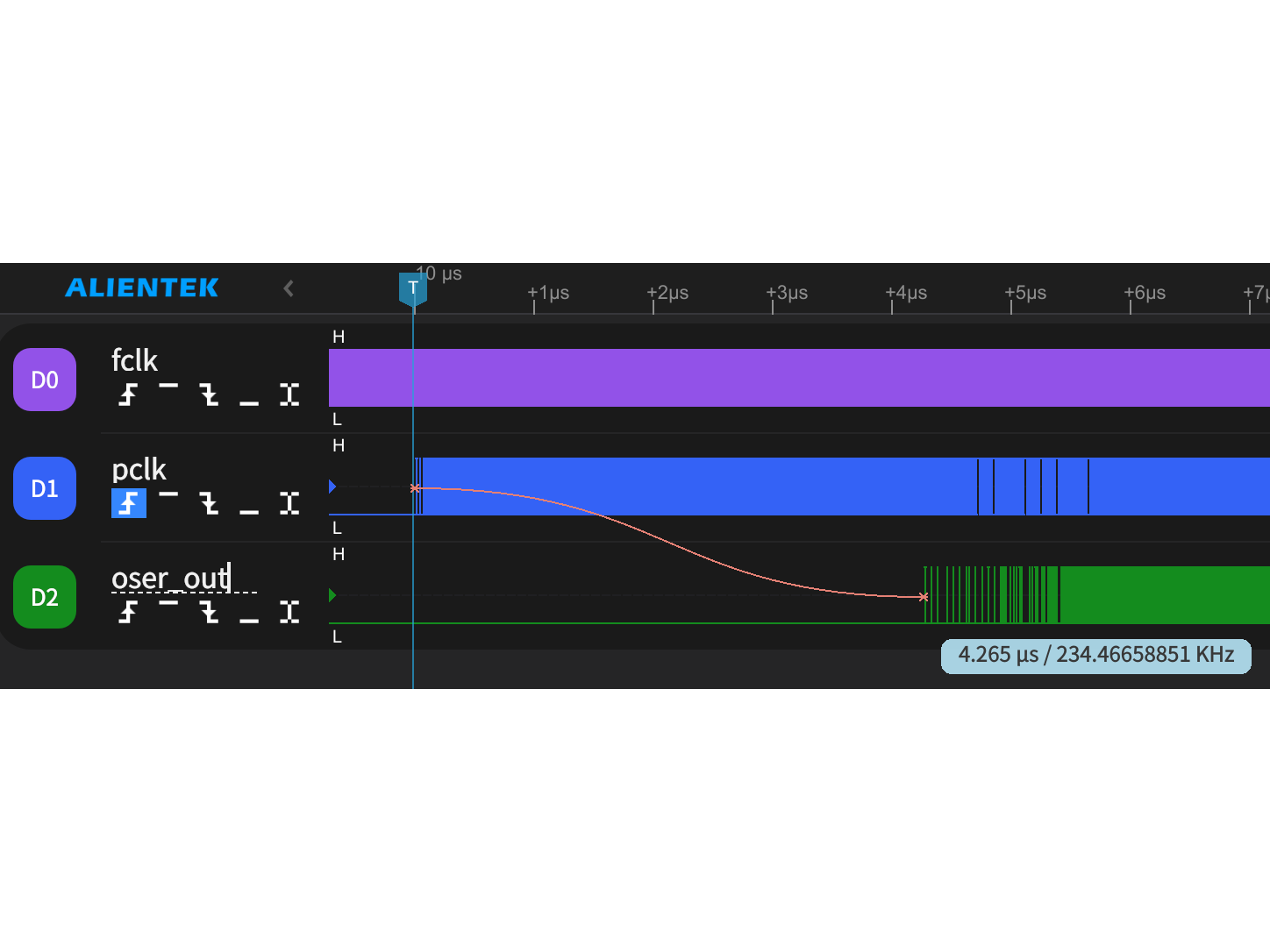 DSLogic は fclk に時々歯抜けがあります。pclk はほぼ正確ですが、分解能 2.5ns の単位にパルス幅が丸められています。
