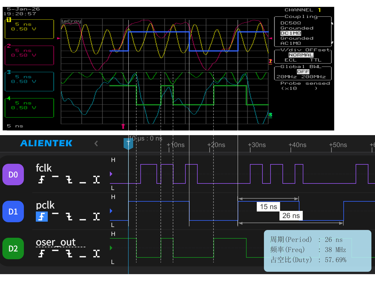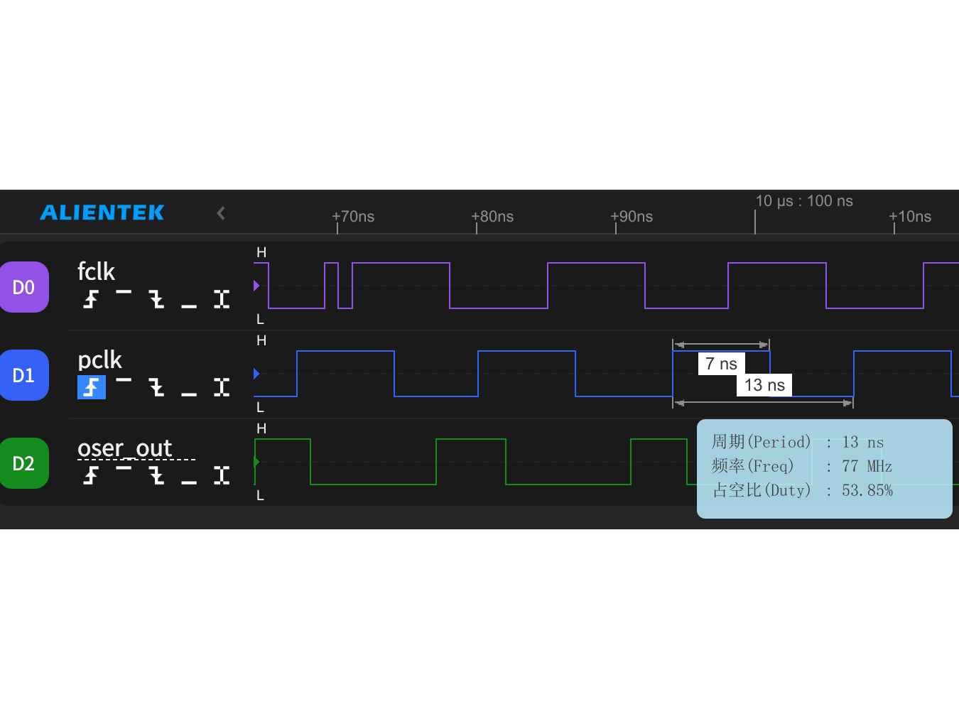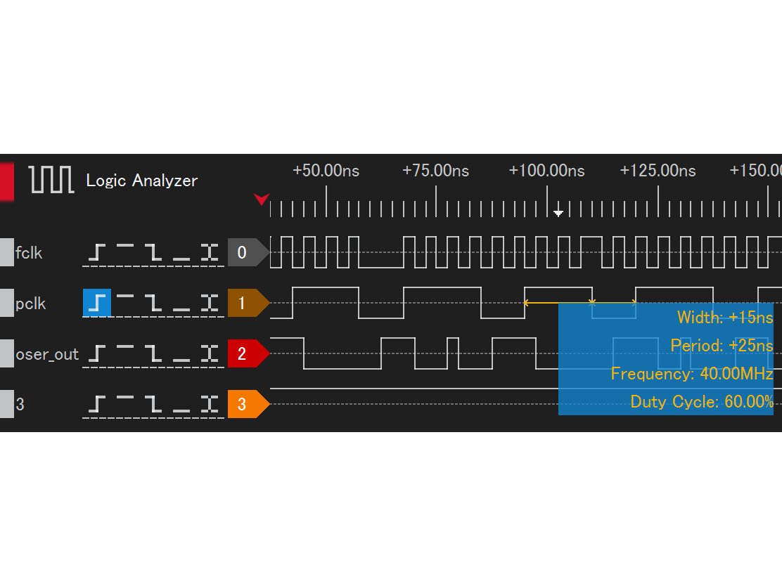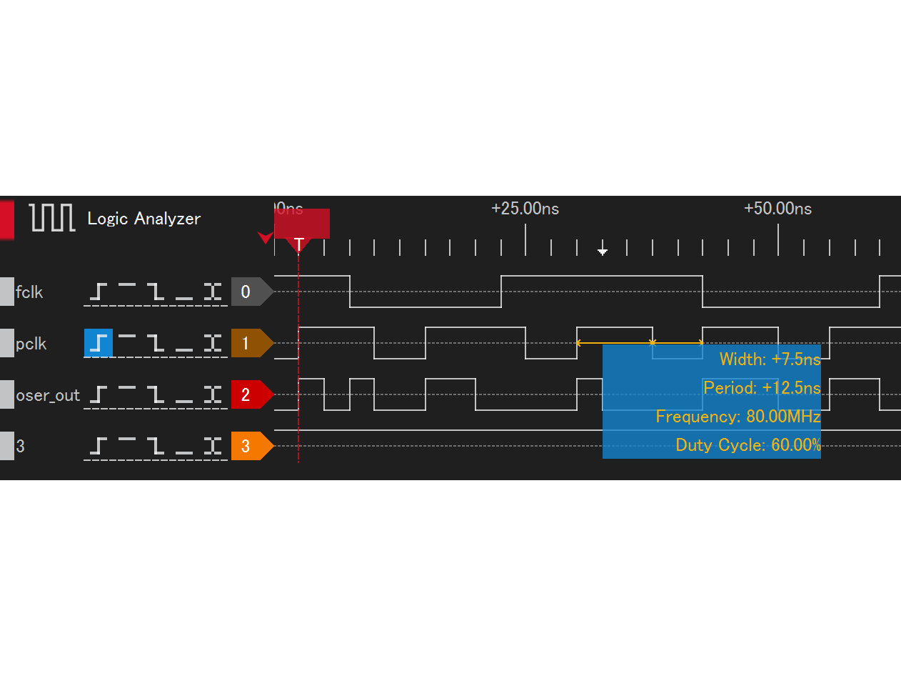 pclk はほぼ正確ですが、アナログ波形での観測より少しデューティ比が低く出ています。
