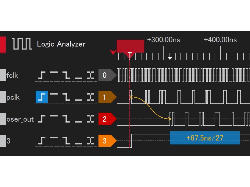 oser_out の波形は定常的な形になっていますし、パルス幅もアナログ波形の観測と一致しています。それなりの正確さで見えてるようですね。