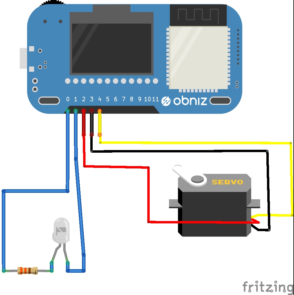 <html> <head> <meta charset="utf-8" /> <meta name="viewport" content="width=device-width, initial-scale=1" /> <link rel="stylesheet" href="https://stackpath.bootstrapcdn.com/bootstrap/4.3.1/css/bootstrap.min.css" /> <link rel="stylesheet" href="/css/starter-sample.css" /> <script src="https://code.jquery.com/jquery-3.2.1.min.js"></script> <script src="https://unpkg.com/obniz@3.14.0/obniz.js" crossorigin="anonymous" ></script> </head> <body> <div id="obniz-debug"></div> <h1>ドムヘッド</h1> <div> <input id="slider" type="range" min="15" max="70" value="45" /> <p>現在の値は<span id="current-value"></span>です<br></p> <button class="btn btn-primary" id="morse">morse</button> </div> <script> const inputElem = document.getElementById('slider'); // input要素 const currentValueElem = document.getElementById('current-value'); // 埋め込む先のspan要素 // 現在の値をspanに埋め込む関数 const setCurrentValue = (val) => { currentValueElem.innerText = val; } // inputイベント時に値をセットする関数 const rangeOnChange = (e) =>{ setCurrentValue(e.target.value); } window.onload = () => { inputElem.addEventListener('input', rangeOnChange); // スライダー変化時にイベントを発火 setCurrentValue(inputElem.value); // ページ読み込み時に値をセット } //io:pin0 led アノード //io:pin1 led カソード //io:pin2 サーボモータ gnd 配線注意 //io:pin3 サーボモータ vcc 配線注意 //io:pin4 サーボモータ signal var obniz = new Obniz("OBNIZ_ID_HERE"); obniz.onconnect = async function () { //サーボモータ用 var servo = obniz.wired("ServoMotor", {gnd:2, vcc:3, signal:4}); servo.angle(50.0); //io起動 モノアイ用 obniz.io1.output(false); await obniz.wait(3000); var pwm_red = obniz.getFreePwm(); pwm_red.start({io:0}); //await obniz.wait(5000); //モノアイ点灯 //ぼわーんと光ったあと チカっとする×2 const red_val = 0; for(let i=0; i<80; i++){ pwm_red.duty(red_val+i); await obniz.wait(100); } await obniz.wait(1000); pwm_red.duty(100); await obniz.wait(200); pwm_red.duty(0); await obniz.wait(200); pwm_red.duty(100); await obniz.wait(200); pwm_red.duty(0); await obniz.wait(200); pwm_red.duty(100); //サーボモータ制御 $("#slider").on('input', function() { servo.angle($("#slider").val()) pwm_red.duty(100); }); //モールス信号 // $("#morse").on("touchstart mousedown", () => { $("#morse").on("touchstart", () => { pwm_red.duty(100); obniz.display.clear(); obniz.display.print('●'); }); // $("#morse").on("touchend mouseup", () => { $("#morse").on("touchend", () => { pwm_red.duty(0); obniz.display.clear(); obniz.display.print('-'); }); } </script> </body> </html>