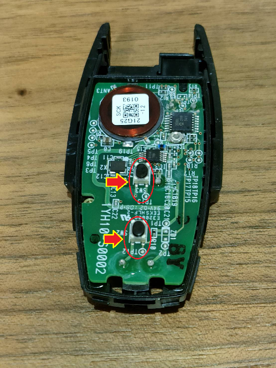 以下の写真は、今回操作したいリモコンの写真である。矢印で示した部分にボタンが二つあり、これらをM5Atom Liteから制御することとした。