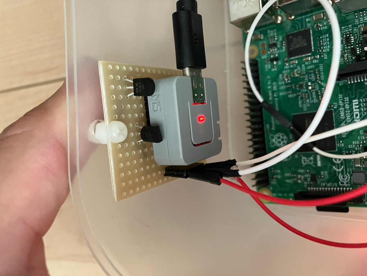 以上の内容の通り、作成することで、M5AtomLiteからリモコンのスイッチを制御することができた。実際に作成したものの写真とテスト用のソースコードを示して本記事の締めとする。