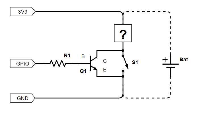 下図に、今回作成したものの回路図の概要を示す。図中のS1がリモコンの押したいボタンを表しており、図中の3V3(※3)、GND及びGPIOはマイコンのピンを表している。リモコンをテスター等で調べた結果、スイッチの一方はGND(電池のマイナス極)と接続されていることが分かった。スイッチのプラス側(「?」の部分)は、リモコンのスイッチ以外の回路が入る。