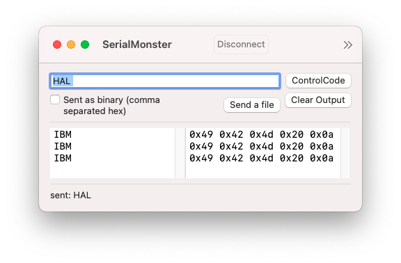 今回は制御文字以外を受け取ったら、1つだけインクリメントして返す、という感じで作ってみた。例えば「HAL(空白)(改行)」と送ると「IBM(空白)(改行)」と返す。