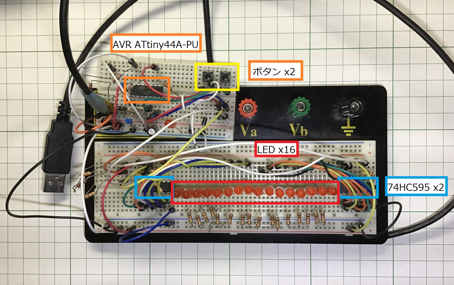 おまけで、16個のLEDをLチカします。これはただ単に見た目重視です。上記のV-USBデバイスの応用用途に困って、とりあえず作った感じです。