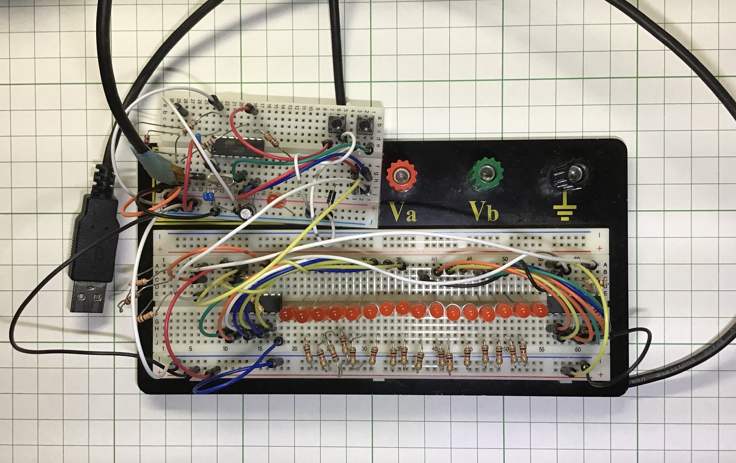 ATtiny44Aは14ピンしかなく、V-USB実装時点で空いているピンは7ピンのみです。そのため、ロジックICを用いて、16個の出力を確保しました。