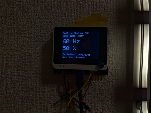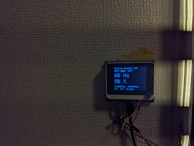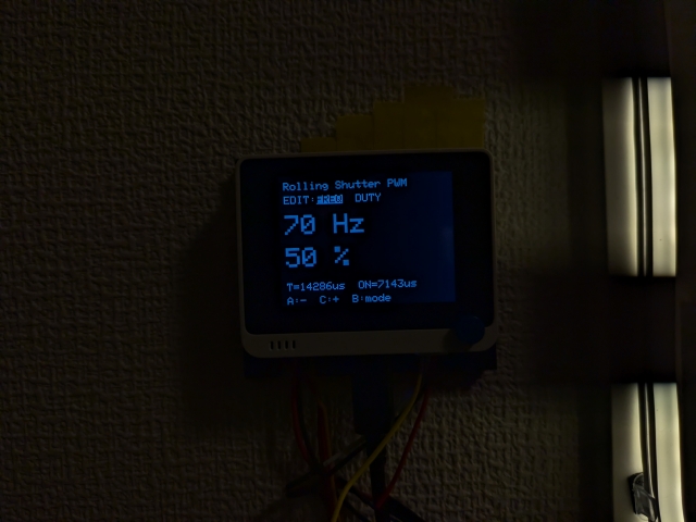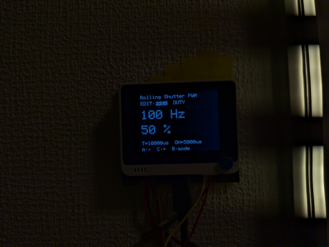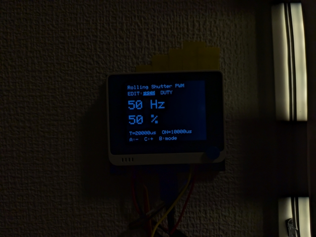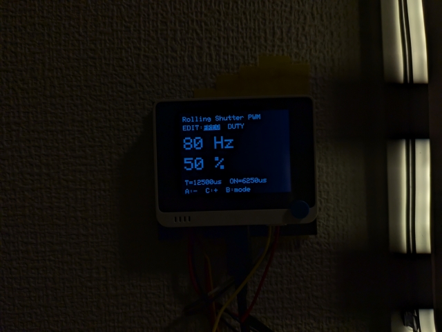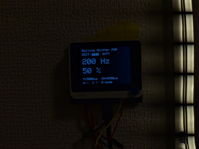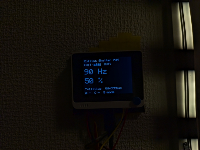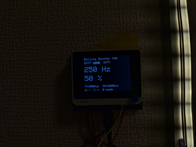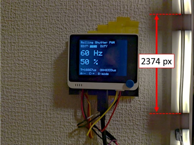 ローリングシャッター速度の計測方法は、点滅LED(Lチカ)を写し込んで縦縞を読む方法で行いました。