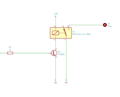 オペアンプからの出力ではリレーを駆動できないので、トランジスタでスイッチング回路を作ってリレーをONにさせる。