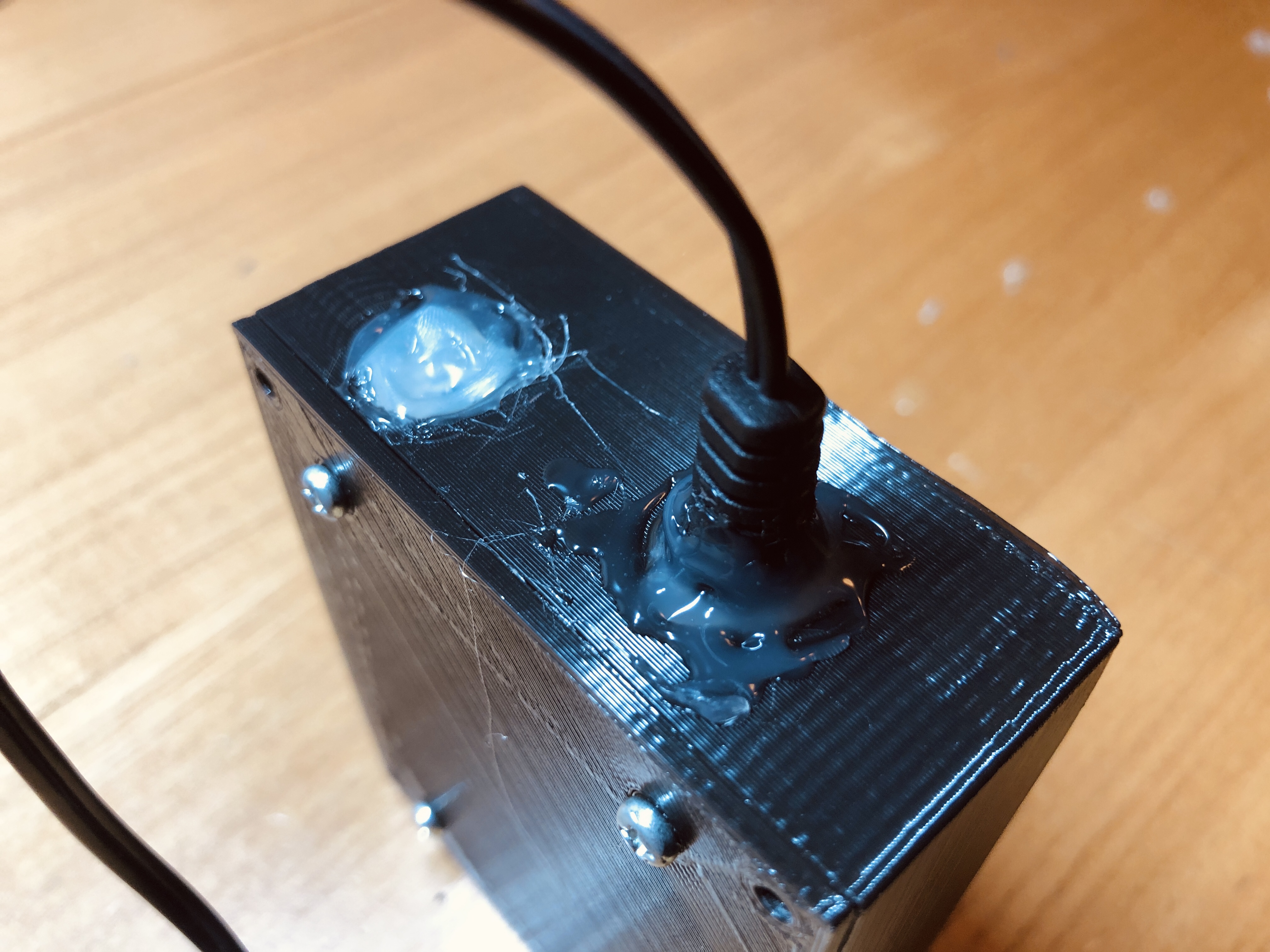 防水はグルーガンで行いました。ガバガバだと思うので秋月の部品と同梱してある、あのシリカゲルも一応入れておきました。