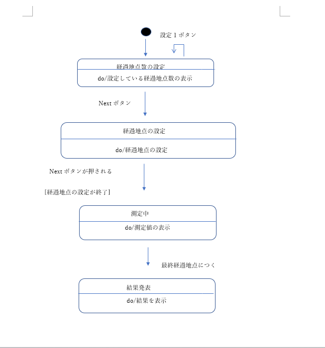コースの設定を実現する方法を説明します。この測定器は緯度経度を使って、コースを設定します。設定するタイミングは状態遷移図の経過地点の設定です。図3の黒い丸は緯度経度で表した経過地点です。地図を見ながらボタンにより自分が好きなところに経過地点を設定し、コースを設定します。