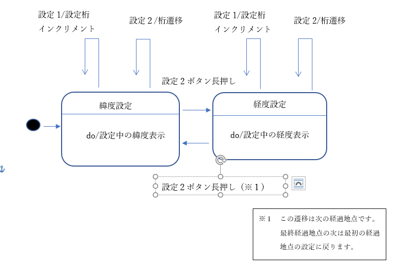 設定2ボタンを長押しすると緯度経度の設定が切り替わります。