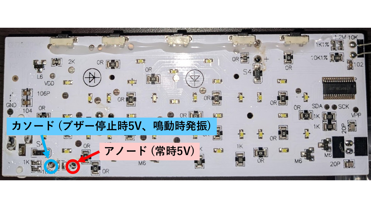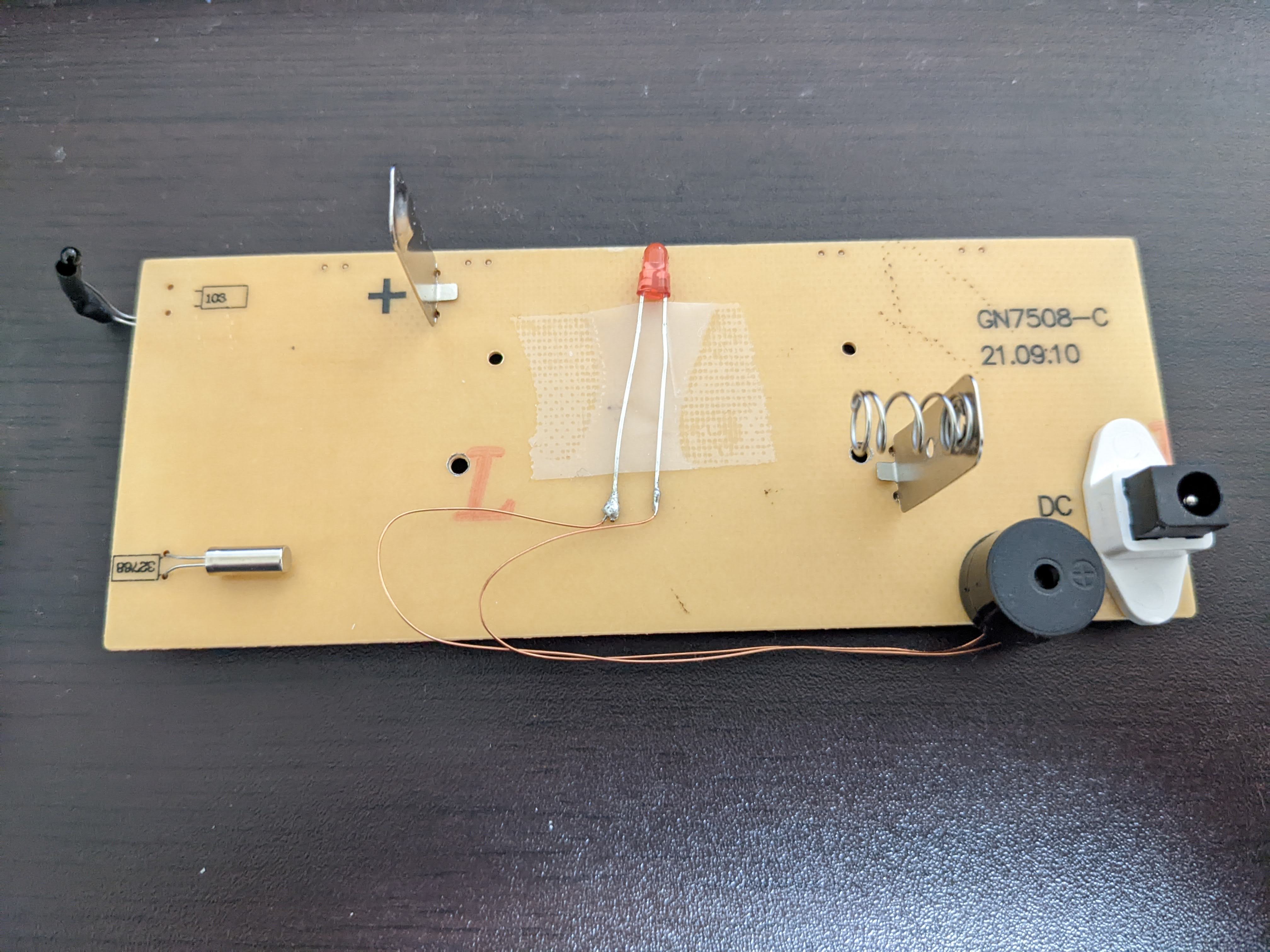 アラームを鳴らしながらブザーの両端子をオシロで測定して極性を調べ、赤色LEDをつないだところ、もくろみ通りLEDが点灯しました。LEDを接続してもブザーも鳴ります。自分の場合は電流制限抵抗無しでほどよく光りましたが、他の機種でやる場合は考慮したほうがよいでしょう。