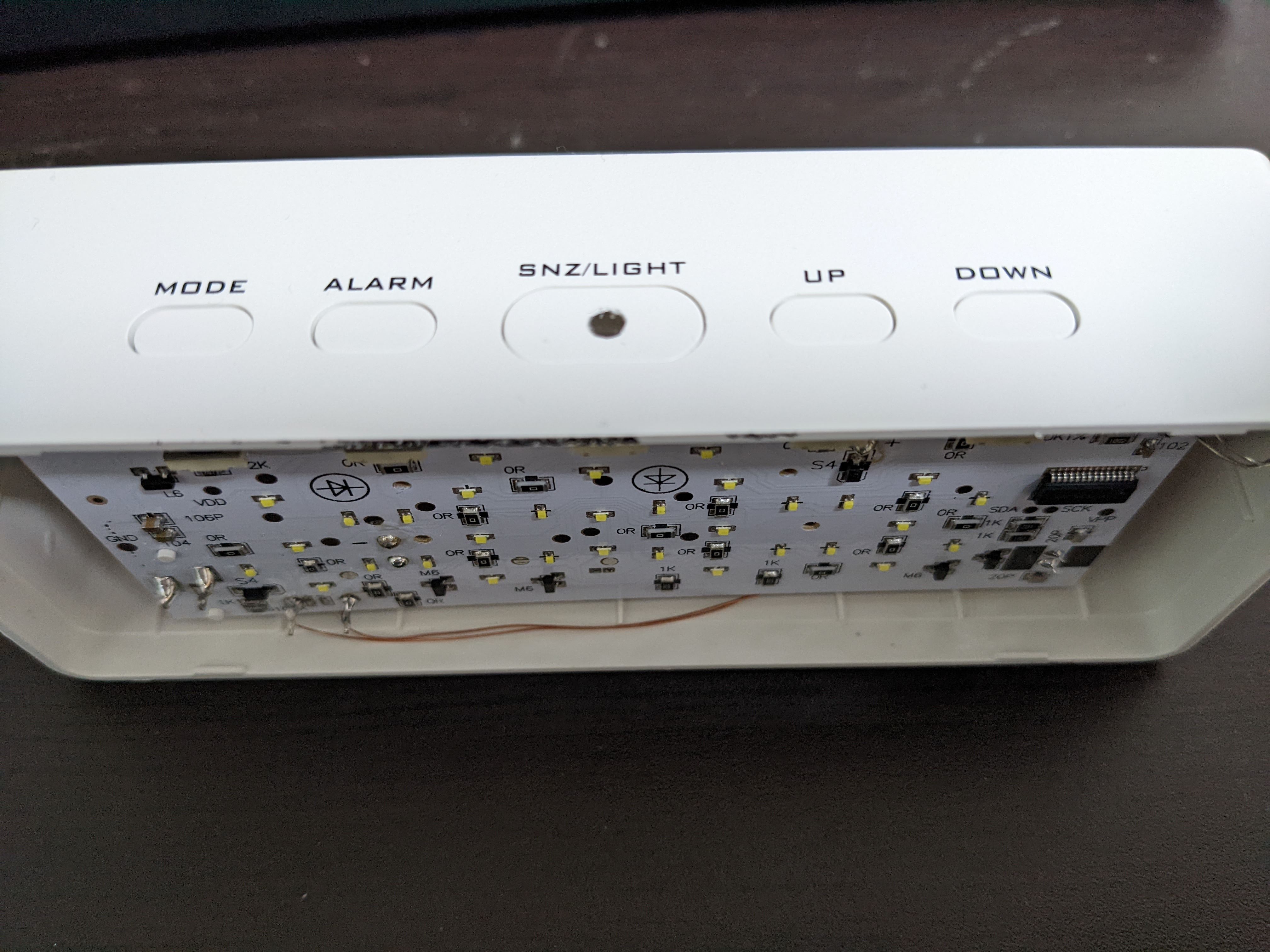 ちなみに、文字盤で「PM」や「AL」とドットマトリクスぽく表示されますが、ミラーの裏側にそういうパターンが描かれていて、それを1個のLEDで照らしているだけです。