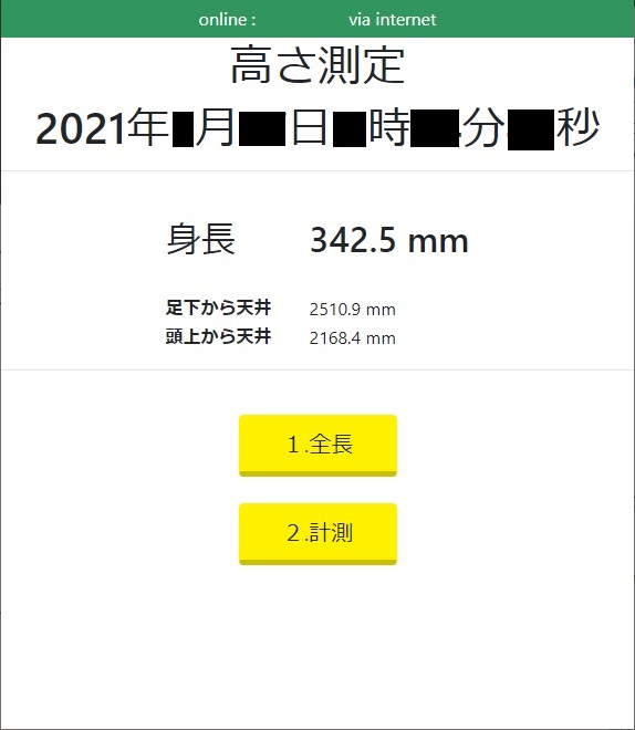 <html> <head> <meta charset="utf-8" /> <meta name="viewport" content="width=device-width, initial-scale=1" /> <link rel="stylesheet" href="https://stackpath.bootstrapcdn.com/bootstrap/4.3.1/css/bootstrap.min.css" /> <script src="https://code.jquery.com/jquery-3.2.1.min.js"></script> <script src="https://unpkg.com/obniz@3.x/obniz.js" crossorigin="anonymous" ></script> <style type="text/css"> a.btn--yellow { color: #000; background-color: #fff100; border-bottom: 5px solid #ccc100; } a.btn--yellow:hover { margin-top: 3px; color: #000; background: # fff20a; border-bottom: 2px solid #ccc100; } </style> </head> <body> <div id="obniz-debug"></div> <h1 align="center">高さ測定</h1> <h1 align="center"><div id="dayValue"/></h1> <hr><br> <table border="0" align="center"> <tr> <th><h2>身長 </h2></th> <td><h2><div id="result"/></h2></td> </tr> <tr> <th> </th> <td> </td> </tr> <tr> <th>足下から天井</th> <td><div id="output1"/></td> </tr> <tr> <th>頭上から天井</th> <td><div id="output2"/></td> </tr> </table> <hr><br> <div align="center"> <a id="btn_Base" class="btn btn--yellow" style="width:25%;padding:10px;font-size:20px;">1.全長</a> <div> </div> <a id="btn_Target" class="btn btn--yellow" style="width:25%;padding:10px;font-size:20px;">2.計測</a> </div> <script> var obniz = new Obniz("OBNIZ_ID_HERE"); var valHeight = 0; var valBase = 0; var valTarget = 0; var valHeightLcd = "- mm"; var valBaseLcd = "- mm"; var valTargetLcd = "- mm"; function getNow() { var now = new Date(); var year = now.getFullYear(); var mon = now.getMonth()+1; //1を足すこと var day = now.getDate(); var hour = now.getHours(); var min = now.getMinutes(); var sec = now.getSeconds(); var s = year + "年" + mon + "月" + day + "日" + hour + "時" + min + "分" + sec + "秒"; return s; } $("#dayValue").text(getNow()); $("#result").text("- mm"); $("#output1").text("- mm"); $("#output2").text("- mm"); // called on online obniz.onconnect = async function() { var sensor = obniz.wired("GP2Y0A21YK0F", {vcc:2, gnd:1, signal:0}) var buttonBase = obniz.wired("Keyestudio_Button", {signal:4, vcc:5, gnd:3}); var buttonTarget = obniz.wired("Keyestudio_Button", {signal:10, vcc:11, gnd:9}); LcdFunction(); function LcdFunction() { obniz.display.clear(); obniz.display.font('Avenir',18) obniz.display.pos(5,2); obniz.display.print(valHeightLcd); obniz.display.pos(25,25); obniz.display.print(valTargetLcd); obniz.display.pos(25,45); obniz.display.print(valBaseLcd); } function ResultDistance() { if (valBase > 0 && valTarget > 0) { console.log("ResultDistance") var val = valBase - valTarget; if (val > 0) { valHeight = val; var ret = Math.round(val * 100) / 100 + " mm"; $("#result").text(ret); valHeightLcd = ret; } else { $("#result").text("ERROR"); } } } async function BaseDistance() { console.log("BaseDistance"); var val = await sensor.getWait(); valBase = val; var ret = Math.round(val * 100) / 100 + " mm"; $("#output1").text(ret); valBaseLcd = ret; ResultDistance() LcdFunction(); } async function TargetDistance() { console.log("TargetDistance"); var val = await sensor.getWait(); valTarget = val; var ret = Math.round(val * 100) / 100 + " mm"; $("#output2").text(ret); valTargetLcd = ret; ResultDistance() LcdFunction(); } buttonBase.onchange = function(pressed){ console.log("pressed1:" + pressed) if(pressed){ BaseDistance(); } }; buttonTarget.onchange = function(pressed){ console.log("pressed2:" + pressed) if(pressed){ TargetDistance(); } }; document.getElementById('btn_Base').addEventListener('click',function() { BaseDistance(); }); document.getElementById('btn_Target').addEventListener('click',function() { TargetDistance(); }); }; // called on offline obniz.onclose = async function() { valBase = 0; valTarget = 0; }; </script> </body> </html>