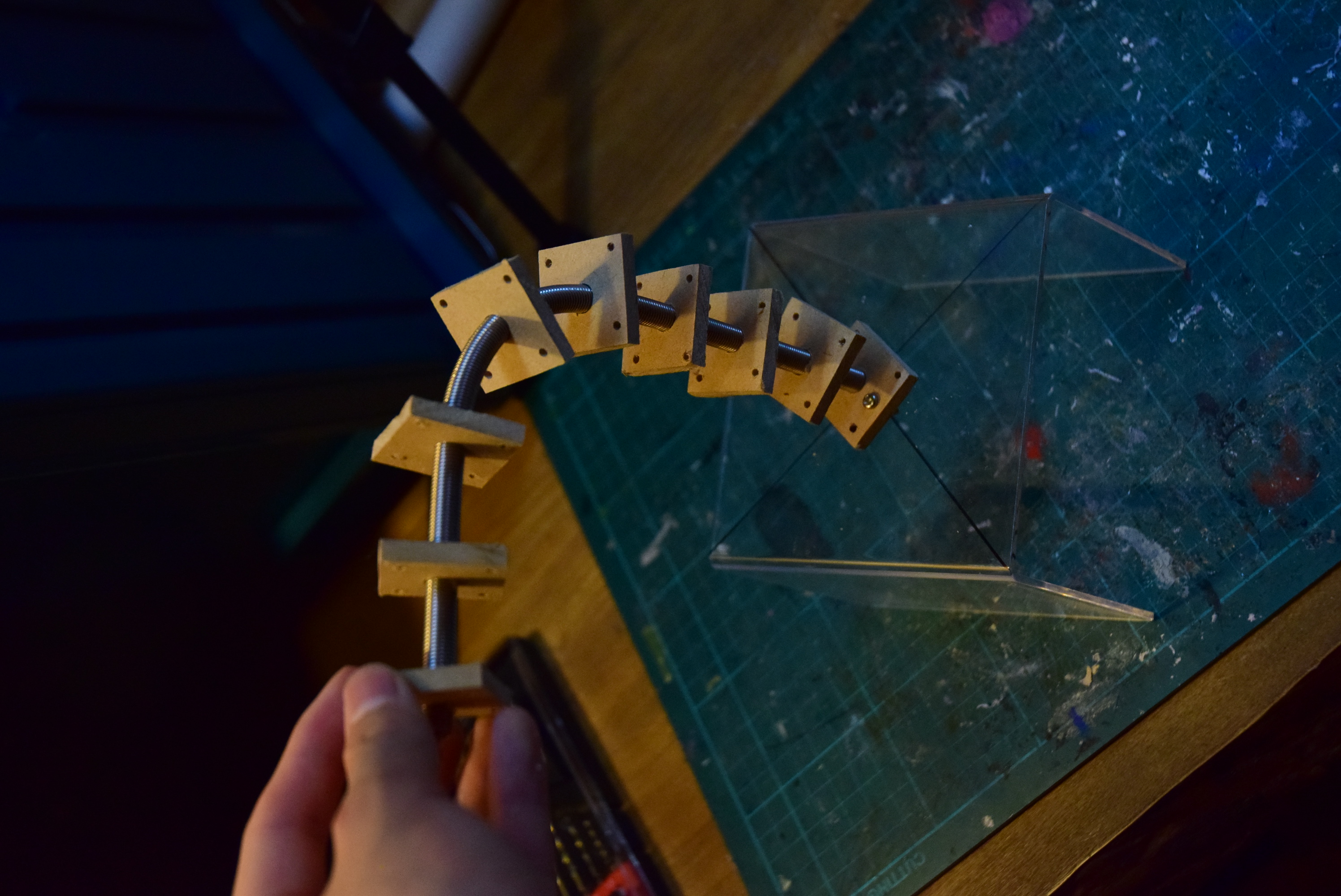 この穴を通る紐は上部の関節を曲げる働きをします。なので、アームの下部の働きには干渉しないように、なるべく中心に近い場所に開けます。