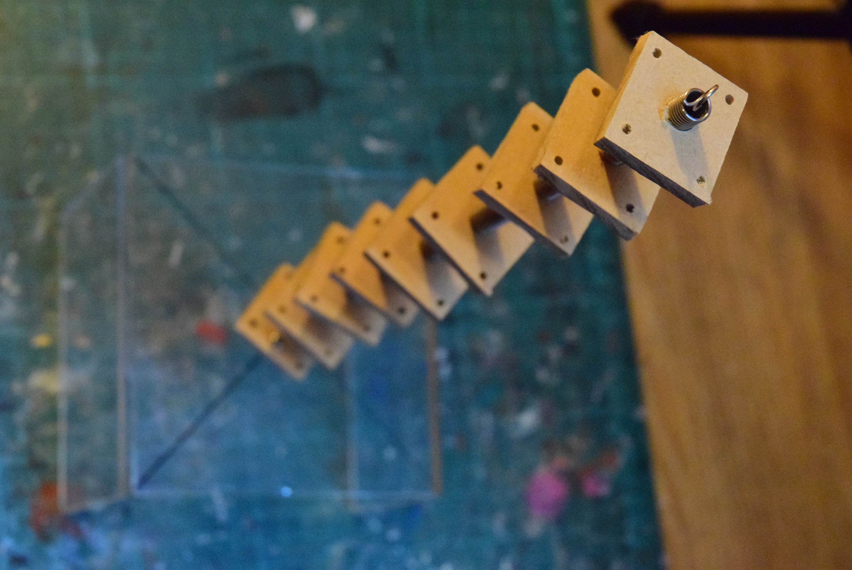 画像の中心を通っているのが”つるまきバネ”です。私は20cmほどのものをホームセンターで買いました。結構高くて、600円ぐらいしました。たぶんつるまきバネではなく、ふつうのバネでも大丈夫です。