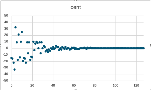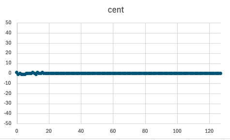 Foscが1MHzの場合だとノート番号77以降で誤差が0セントになる。実際には10セント程度は人の耳では識別できないし、これはこれで味があるとも言えるが、せっかくデジタルなんだからもう少し頑張りたい。
