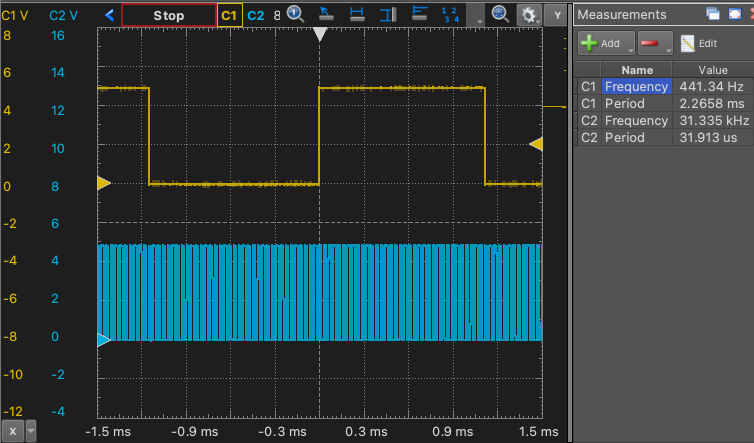 あとはNCO1を設定すればいい。入力はCLCにしてRA2に出力する。インクリメントの0x07358はLFINTOSC周波数が31.25kHzの場合の440Hz出力のための値であり、測定するとかなりいいとこまでイケてるし、微調整も可能だろう。