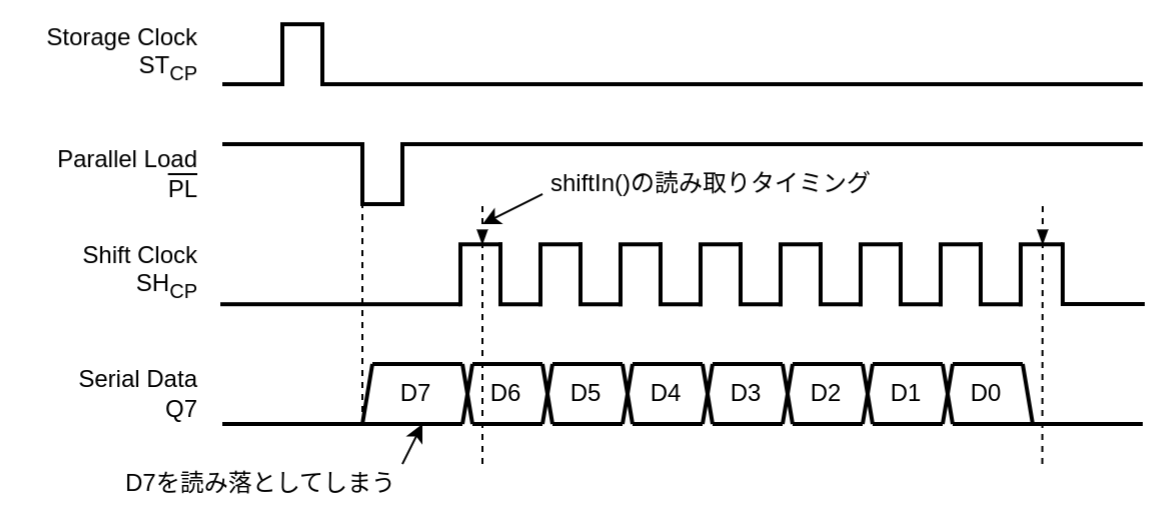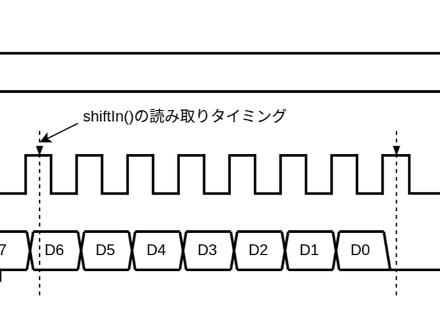 が送られたときに にはビットデータ D7 が出力されますから、shiftIn() 関数が を HIGH にするとデータがシフトしてしまいます。shiftIn() 関数は を HIGH にしてからデータを読み込むので、結果的に D7 を読み落としてしまいます。