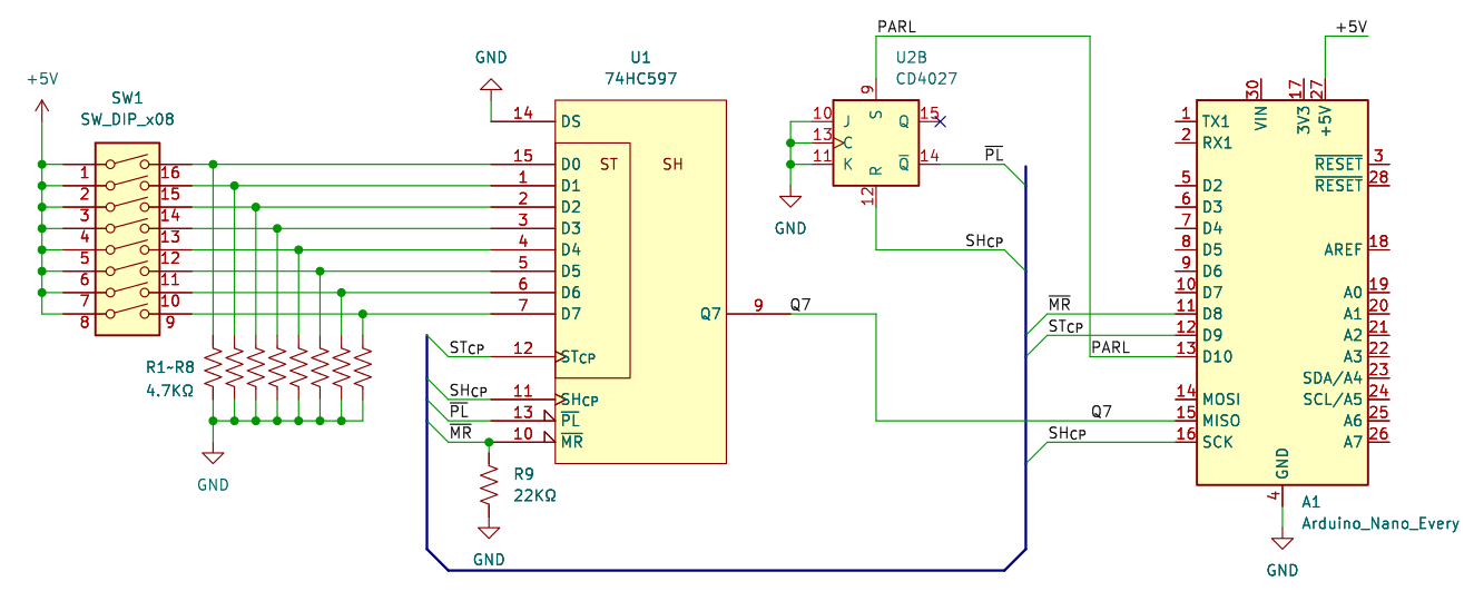 JKフリップフロップ CD4027 を利用した RSラッチは、パラレルロード の制御を行なっています。Arduino からのパラレルロード制御信号 で RSラッチをセットし、シフトクロック でリセットします。