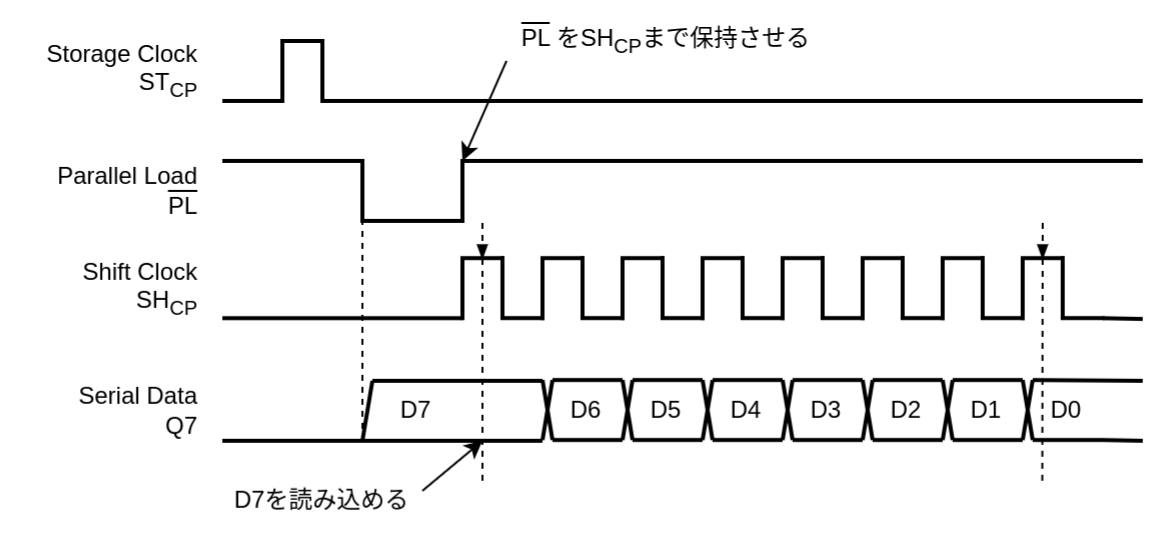- パラレルロード でストレージレジスタのデータをシフトレジスタへ移す