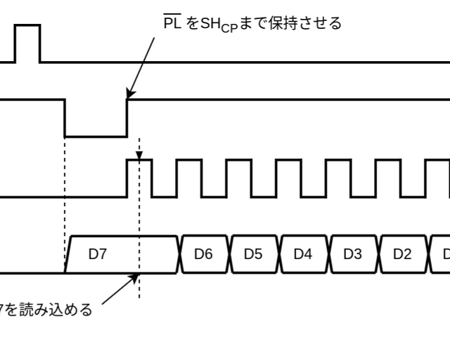 - シフトクロック によりデータを順次シフトし、シリアル信号 としてに出力する