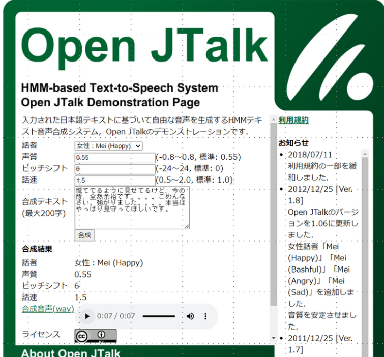 Open J Talkにて発話させたいメッセージのテキストを入力、自分好みの音質・速度に調整し、音声合成します。