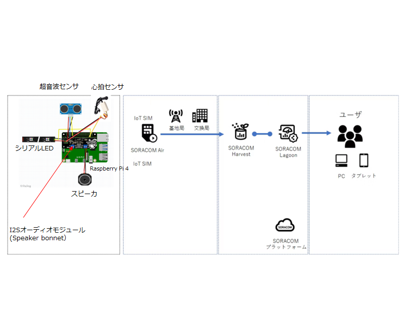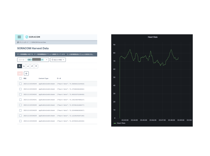 ③ SORACOM AirでSORACOMのプラットフォームと接続、心拍数のデータをJSON形式にてHarvestに送ります。