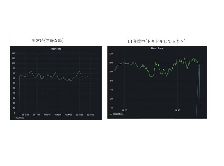 ⑤ ユーザはPC、タブレットで登壇者のドキドキ状態(心拍数)をグラフで確認できます。