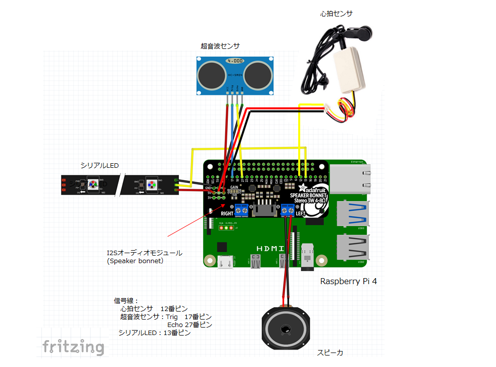 ② 超音波センサの前に手をかざすと、DACオーディオアンプに接続したスピーカからI2Sにより心拍数に応じた