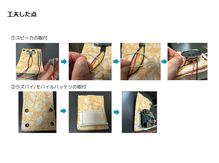 ④配線図をみながらジャンパ線を使ってRaspberry Pi(音声モジュール)と電子部品を接続し、ハーネスなど結束していきます。