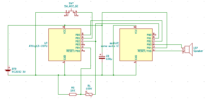 単純なタイマー機能のみなのでATTiny13Aを使用することにした。音の出力はaP23085というオーディオICを使用する。