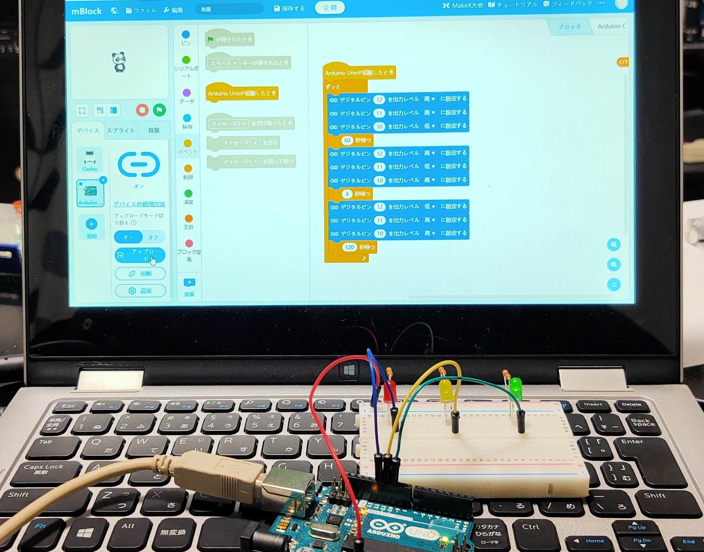 子供が簡単にプログラムを作成出来るようにmBlockを用いてプログラミング行う。