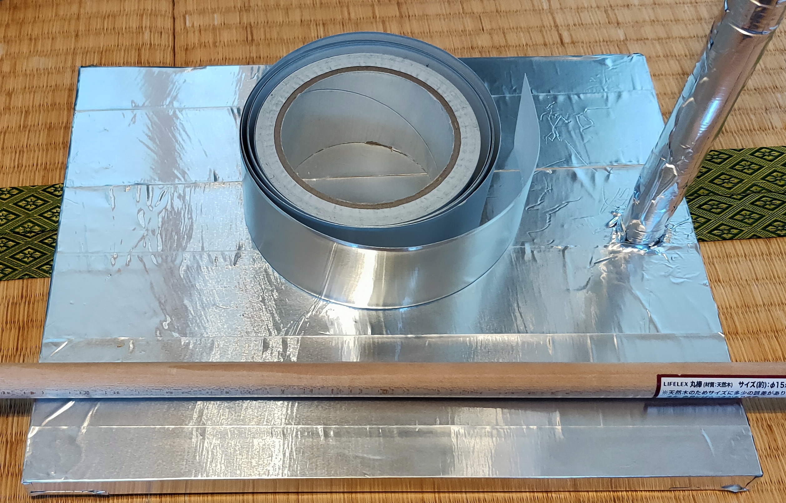 木材を加工し、支柱を組み立てる。木材の周りにはアルミテープを巻くことで本物の様な質感にした。