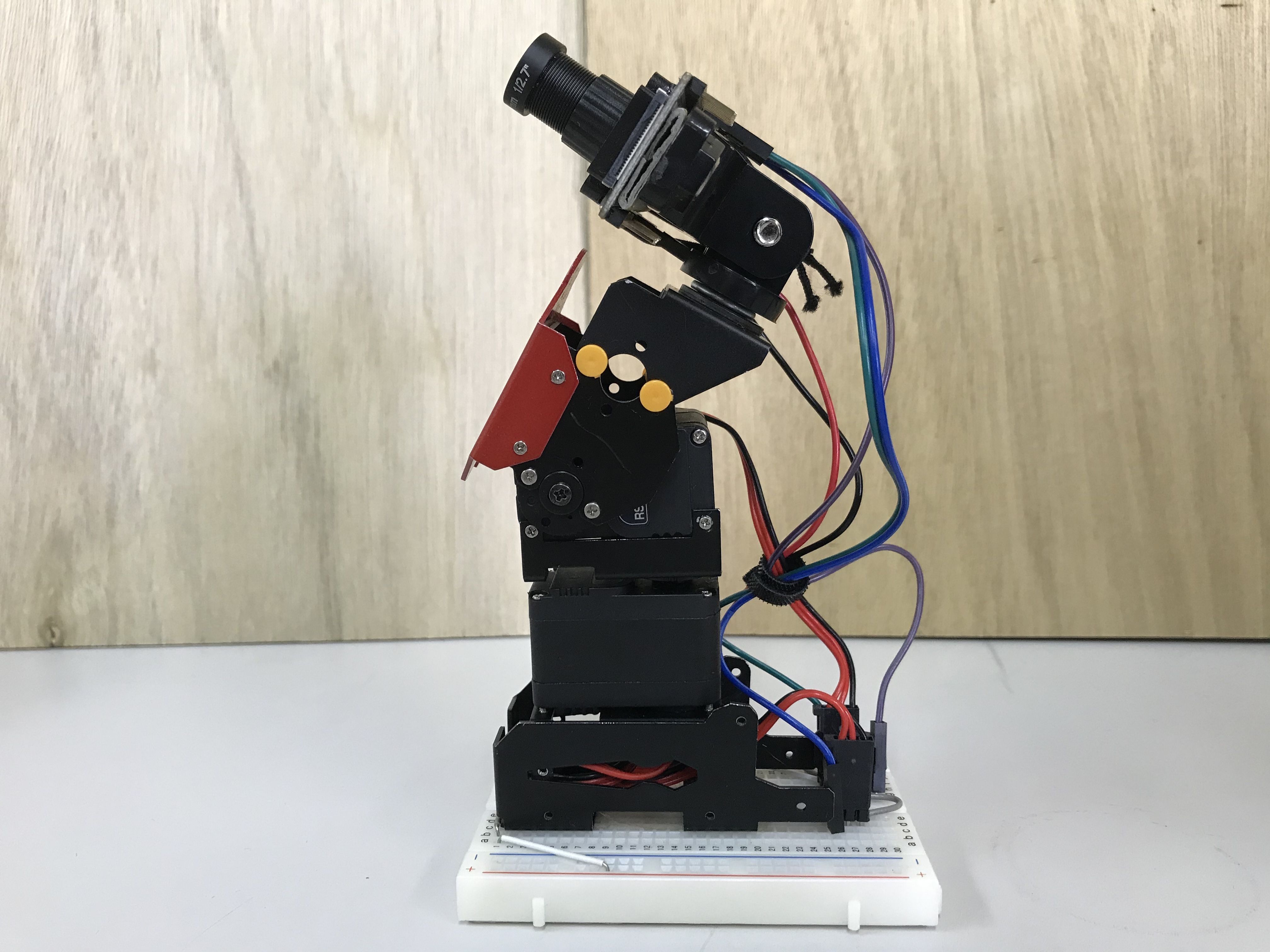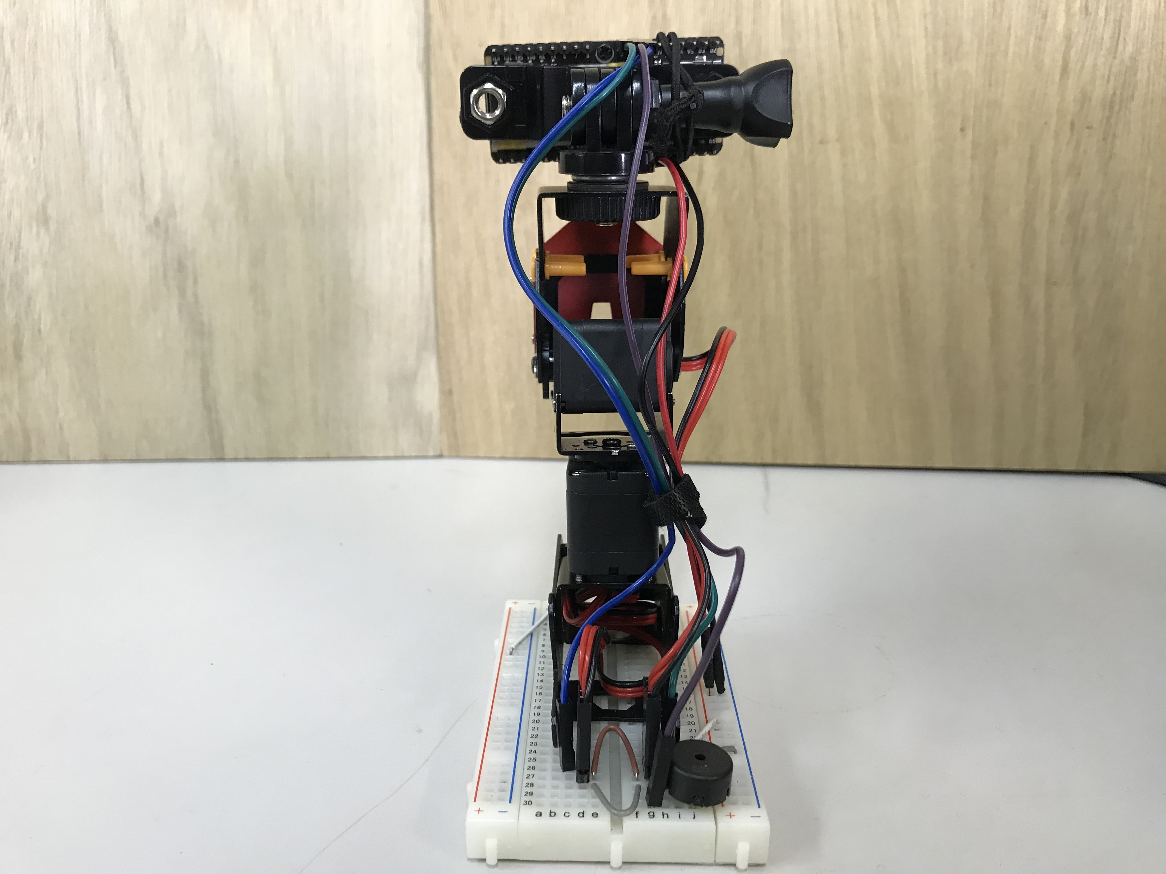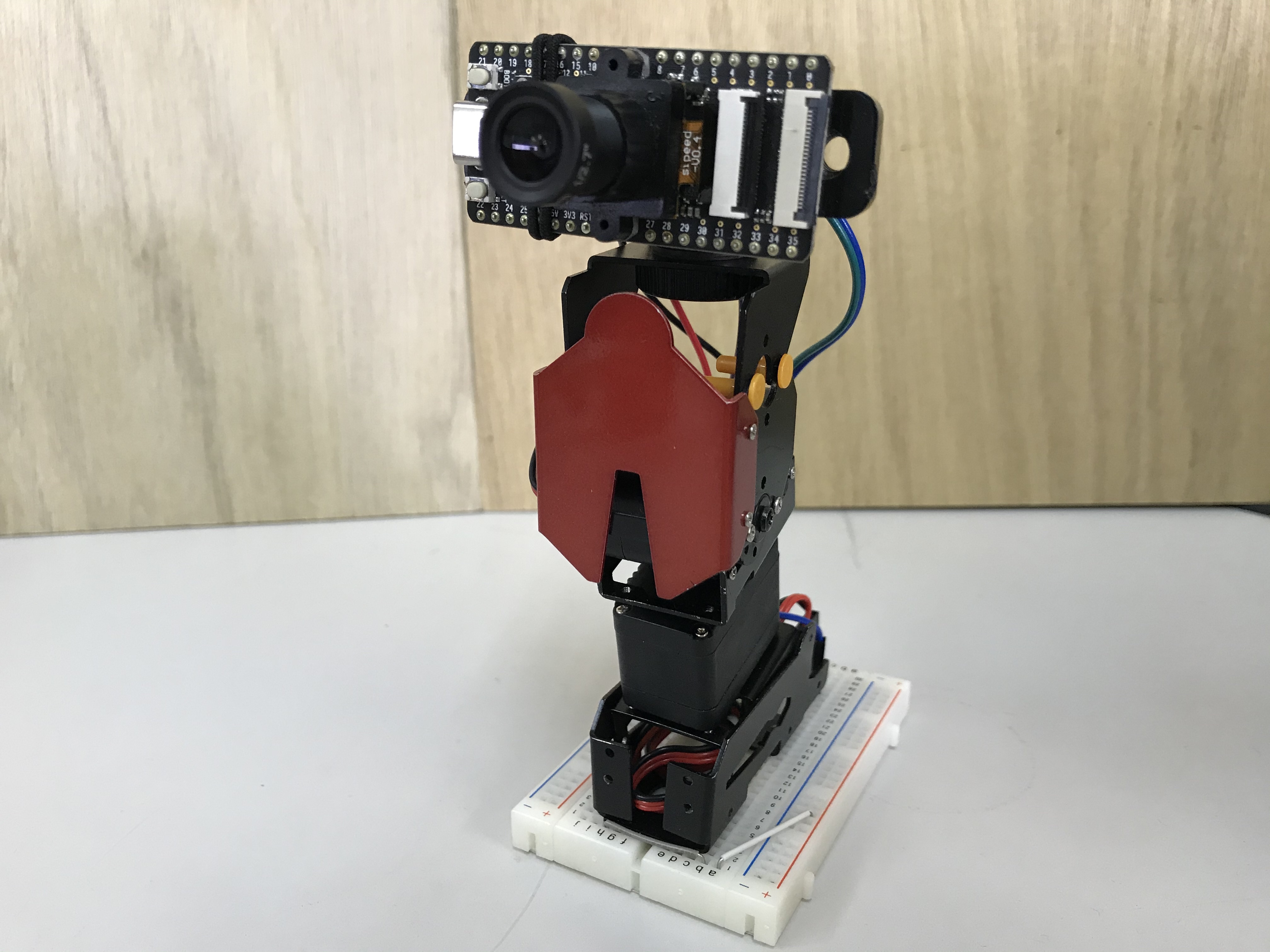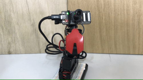 2軸マニピュレータの先端に搭載されたMaixBitのカメラで人の顔を検出し、二つのサーボモータで首先を横、縦の2方向に振ることができます。待機中は首を横に振って人の索敵?を行い、人を見つけたあとは画像内の顔位置から回転角を計算して相手を正面に捉え、サウンドを鳴らす&LEDを点灯しながら頭を縦に振ってお辞儀を行います。