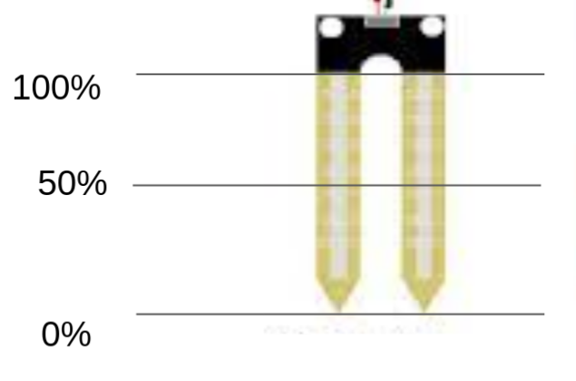 今回使用しているセンサはYL-69という土壌センサで、このセンサは下の図のように水に浸っている量によって出力電圧が変わるものです。