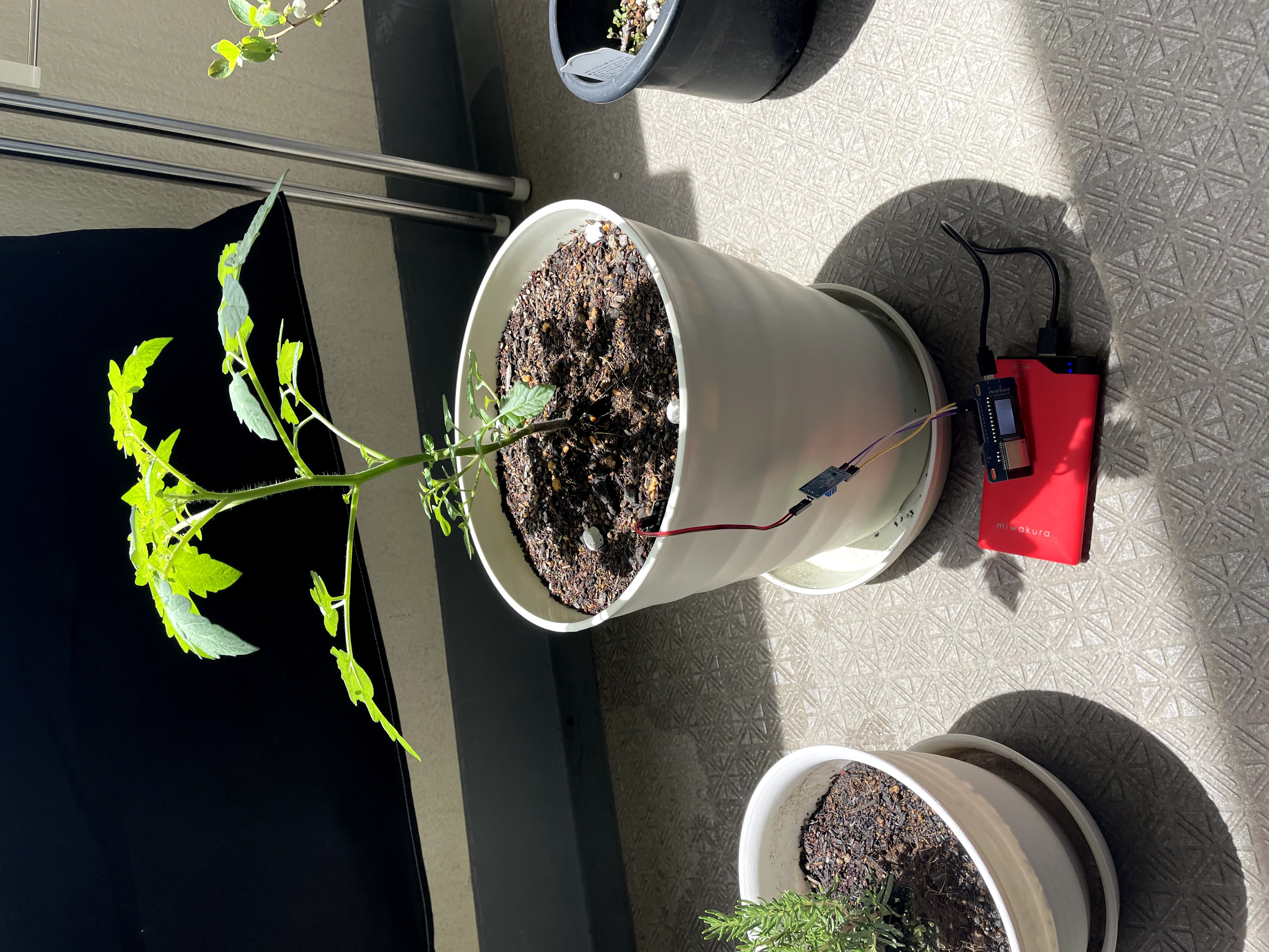 上記画像のように、トマトのプランターにセンサを差し込み、しきい値までプランタ内の水分量が下がったら、LINE APIを用いてLineに通知が行くようにしました。