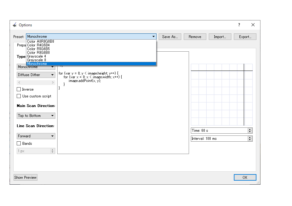 OptionsのConversionから設定を変更します。白黒の画像に変換する場合はMonochromeを、フルカラーの画像に変換する場合はR5G6B5を選択します。