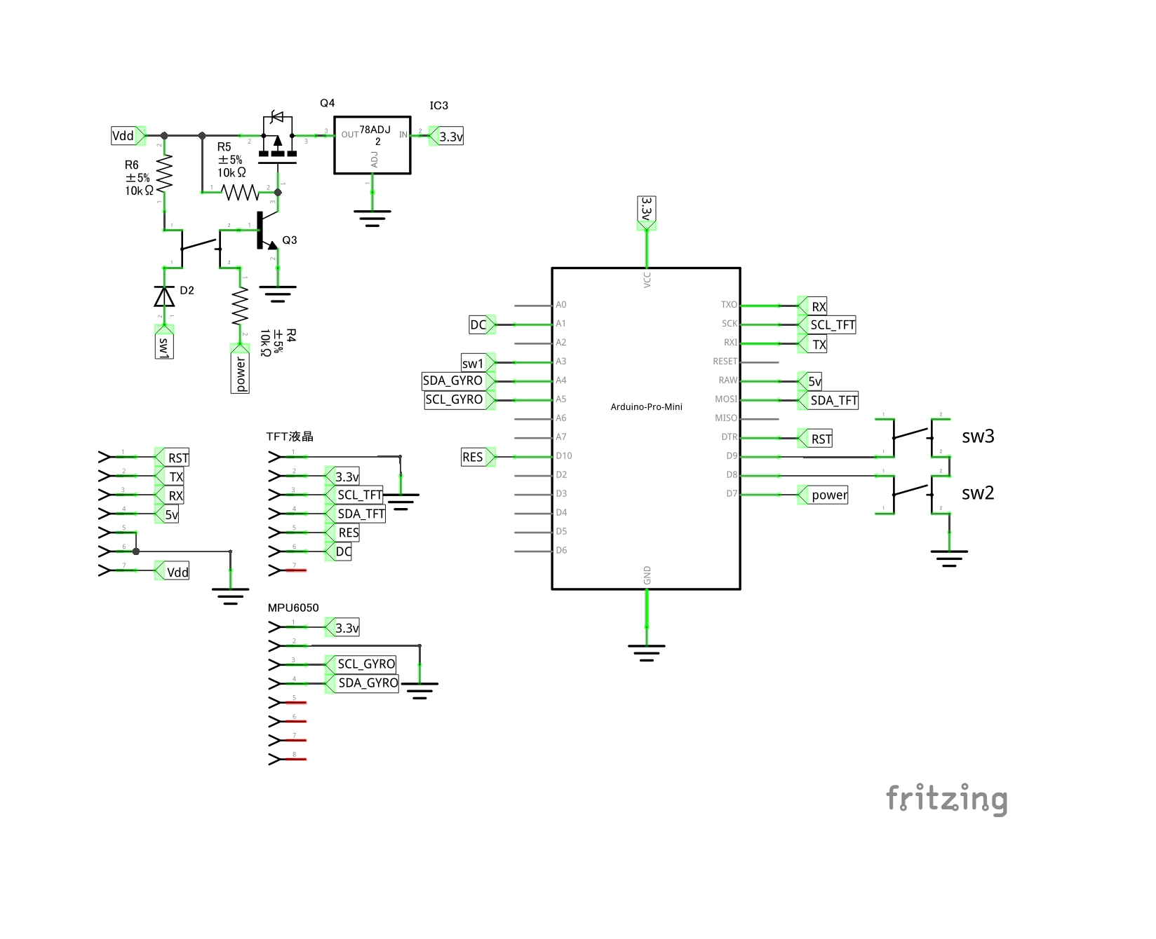 左上は起動回路です。スイッチを長押しし、Arduino起動後powerピンをHIGHにすることで、スイッチを離しても起動し続けます。powerピンをLOWにすることで電源がOFFになります。また起動中にスイッチを押すと、sw1の入力がHIGHからLOWになるので、起動スイッチ以外にも利用できます。