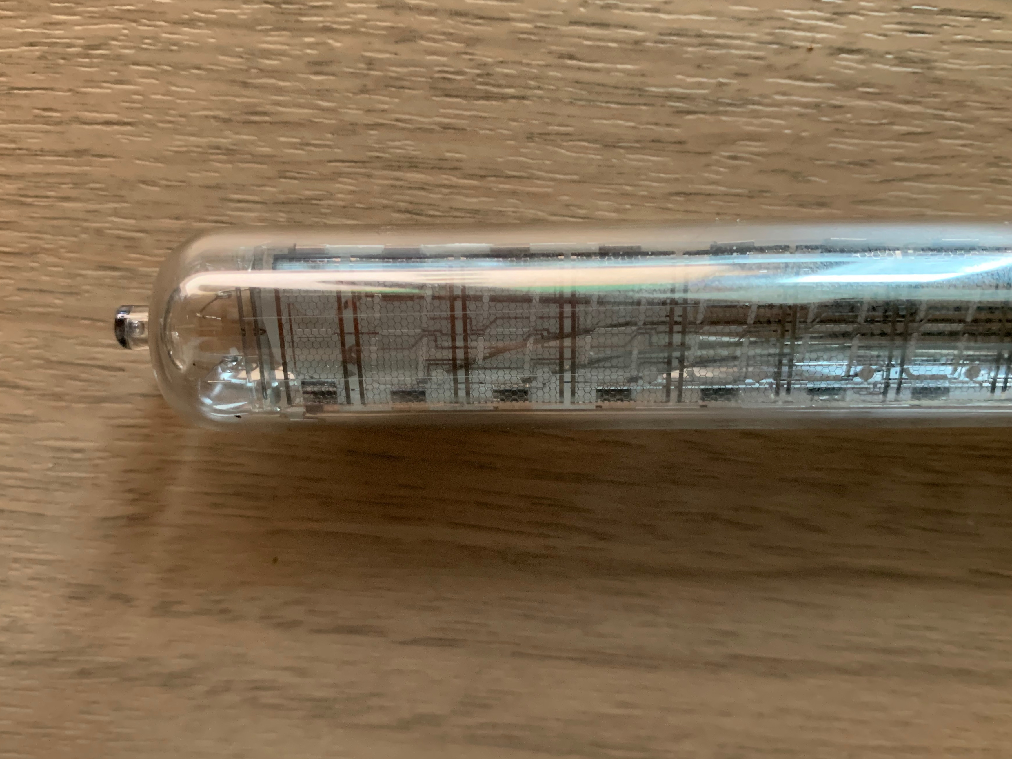 この 青緑色の表示は落ち着きますね。蛍光表示管では、IV-21というこれよりも1回りくらい小さい管もあるのですが、老眼の目ではちょっと離れると時間識別不可能となってしまいます。