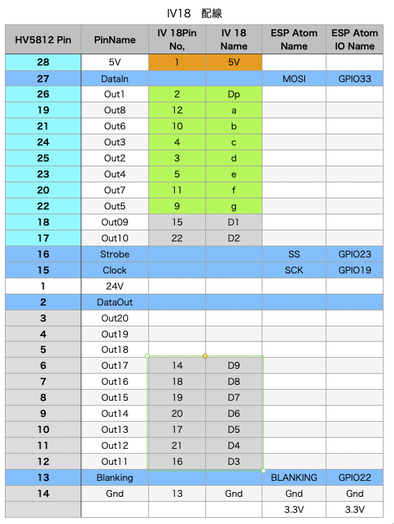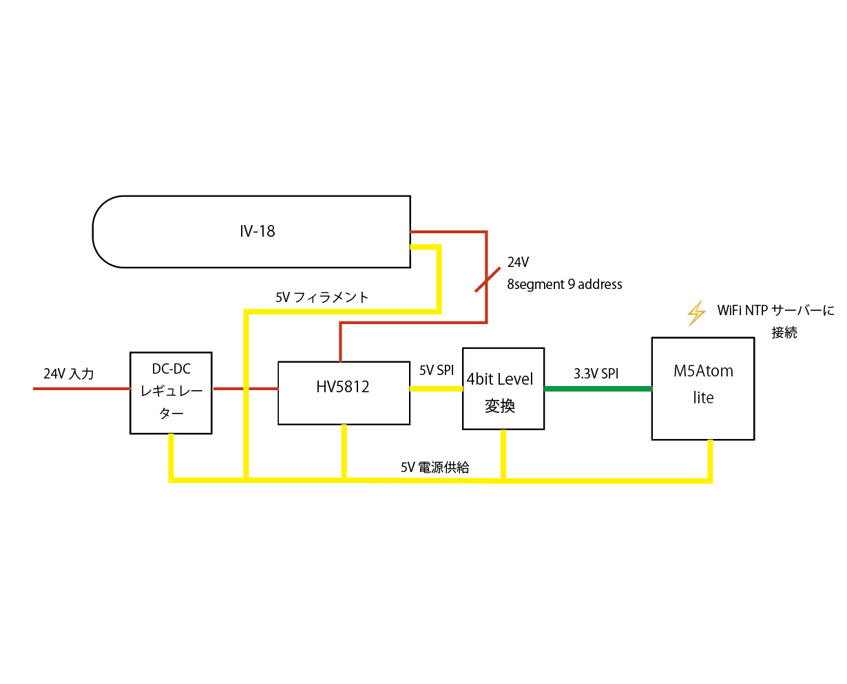 時計のコントロールは、M5Atom liteを使用します。M5Atomは、NTPサーバーから時刻を取得し、内部タイマーをセットします。そのタイマーで時刻データを生成し、3.3V SPIで出力します。それを 4bit Level変換素子で 5V SPIに変換し、HV5812を通して IV-18に表示します。