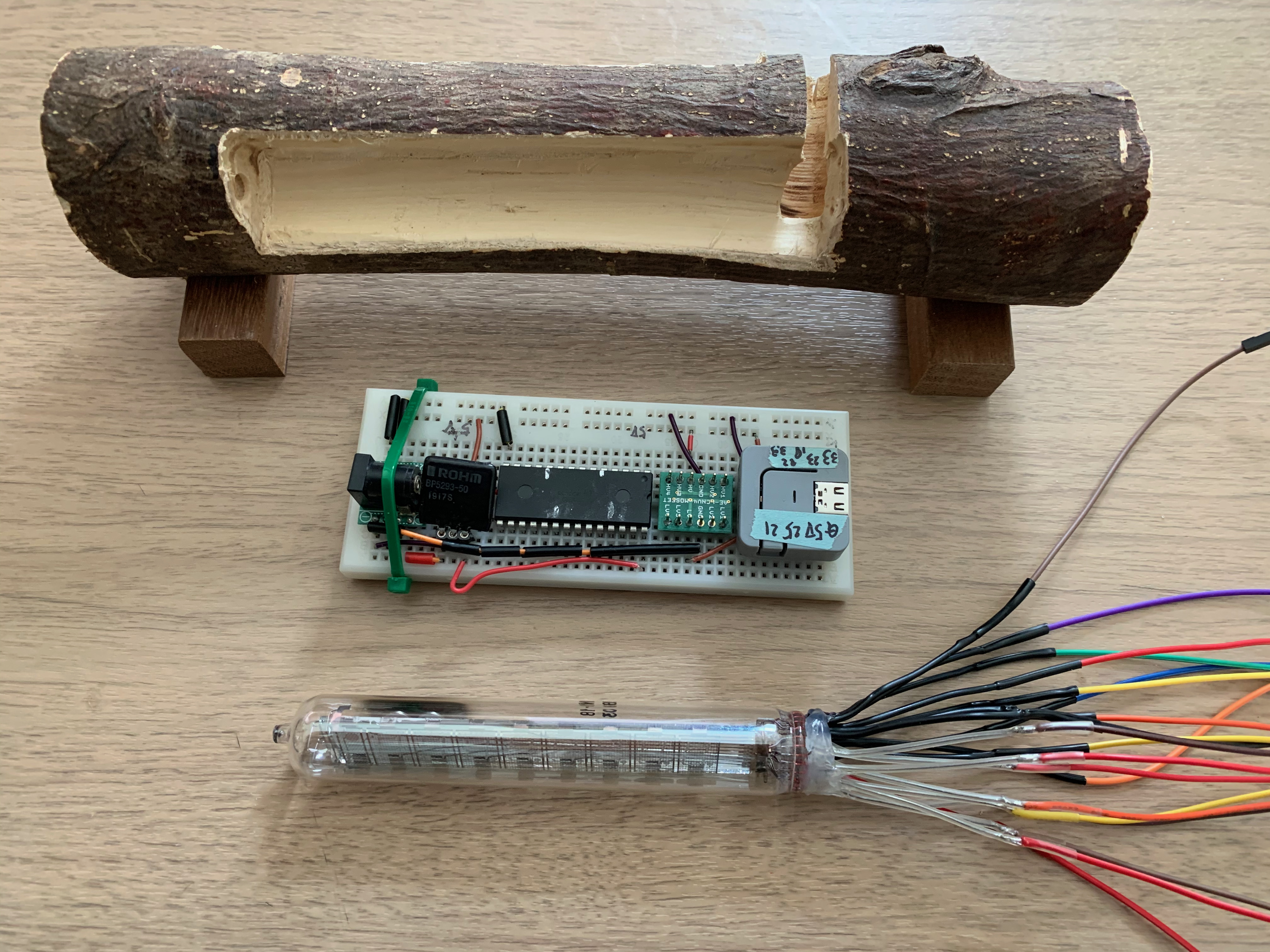 IV-18は、8桁+符号が表示可能なのに、6桁しか使っていない。表示を流すとかして、もう少し派手目にしたい、また日付、温度、湿度とかも表示したい。この投稿で秋月電子通商様の賞品をGetしたら、追加センサーを考えてみようと思います。 - 枝の皮むき(どうしようかな?)