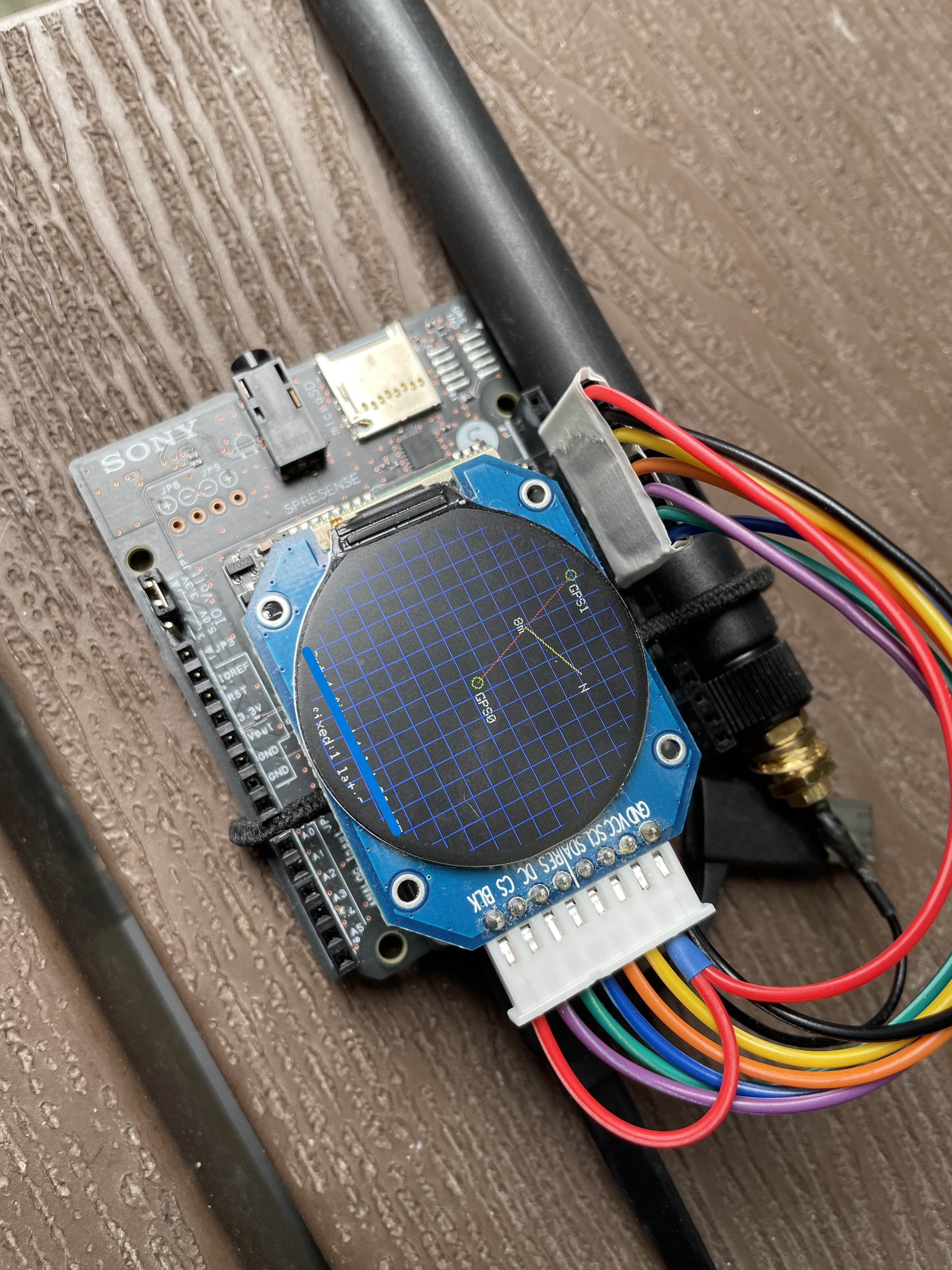 LoRaモジュールが、Spresense間で長距離・低消費電力な無線通信を実現し、位置情報の共有を可能にします。 - ディスプレイ: